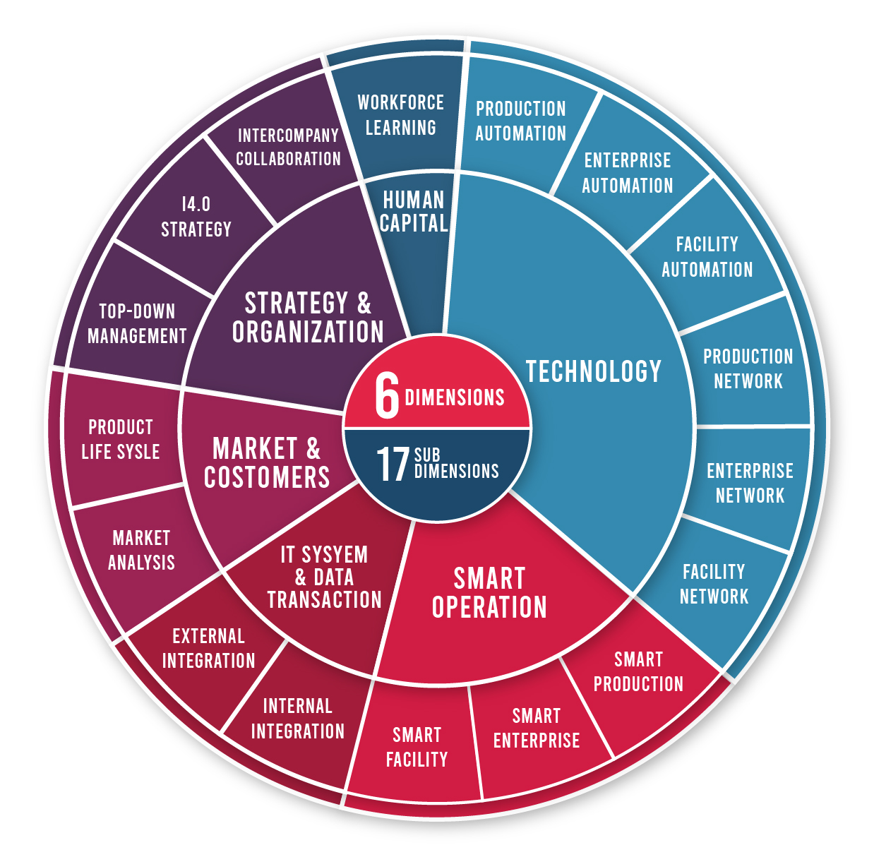 - กลยุทธ์และองค์กร (Strategy & Organization) : กระบวนการทำงานและการนำพาองค์กรจากผู้บริหารไปสู่พนักงาน การวางแผนและพัฒนาขององค์กรสู่อุตสาหกรรม 4.0 โดยวิสัยทัศน์ของผู้บริหารและการร่วมมือกับพันธมิตรภายนอก