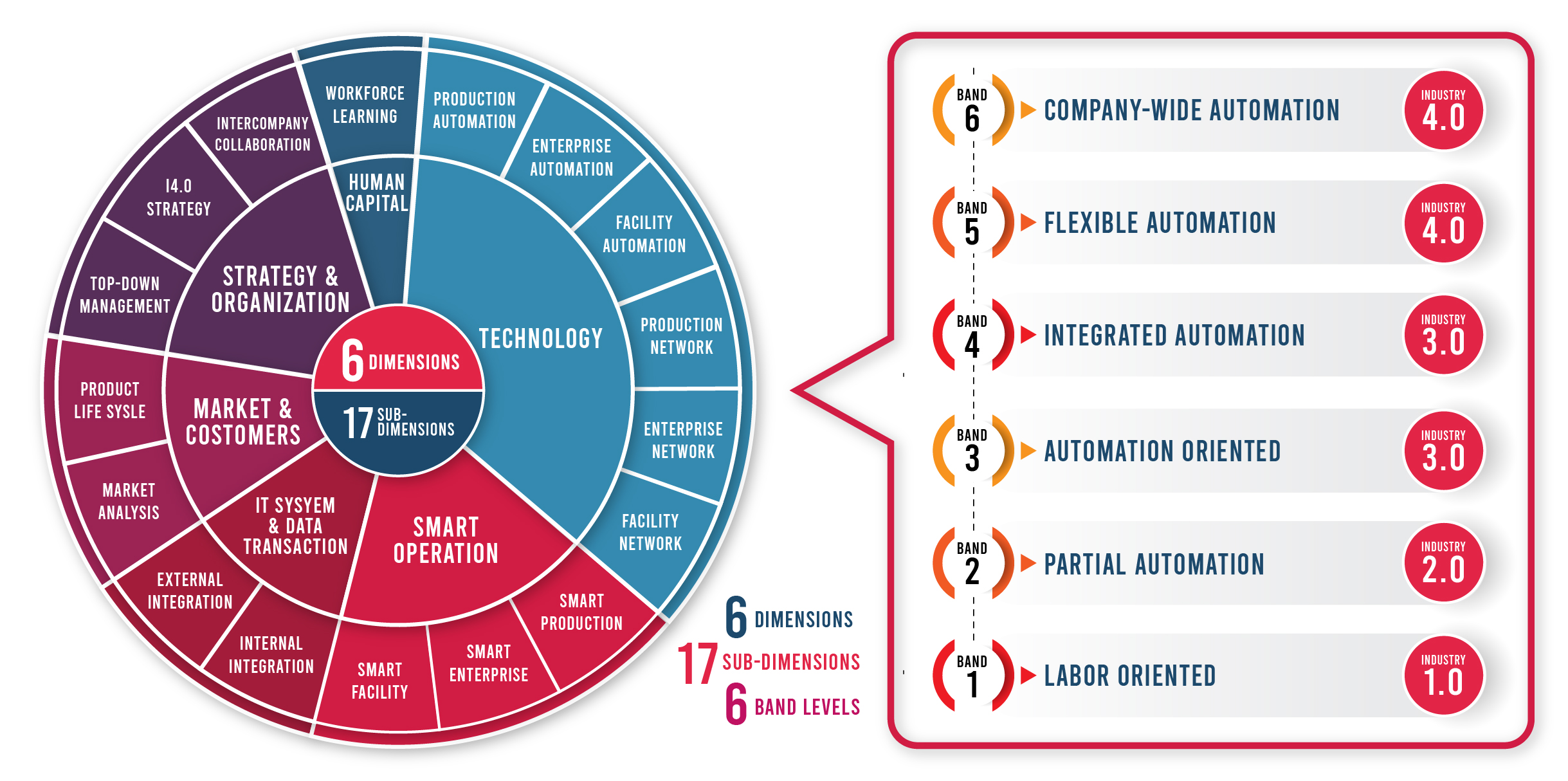 จาก 6 มิติหลัก ได้ถูกแบ่งออกเป็น 17 มิติย่อย เพื่อให้การวัดระดับความพร้อมขององค์กร มีความชัดเจนเพียงพอในการพิจารณา ซึ่งรายละเอียดและคำอธิบายรายมิติย่อย สามารถศึกษาได้จาก สมุดปกขาวเครื่องมือชุดดัชนีชี้วัดอุตสาหกรรม 4.0 สำหรับประเทศไทย และแต่ละมิติย่อยจะมีการกำหนดระดับความพร้อมออกเป็น 6 ระดับ โดยสามารถไล่เรียงจากคุณลักษณะของอุตสาหกรรม 1.0 ถึง อุตสาหกรรม 4.0
