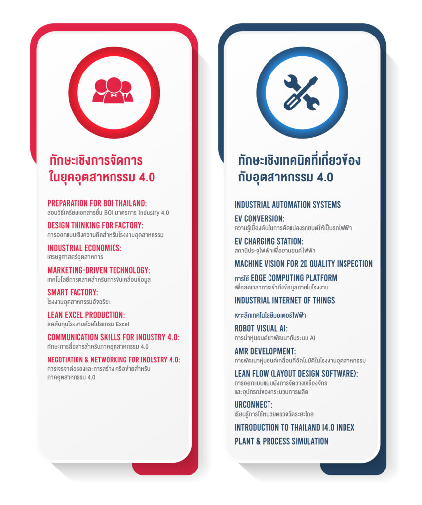 ที่ขับเคลื่อนไปด้วยเทคโนโลยีสู่การเป็นอุตสาหกรรม 4.0 จำเป็นต้องอาศัยการพัฒนาทักษะความรู้ ความสามารถเฉพาะด้านและการบริหารจัดการ Industry 4.0 Platform จึงร่วมกับ ศูนย์นวัตกรรมการผลิตยั่งยืน (SMC) จัดหลักสูตรในการพัฒนาทักษะความสามารถของผู้ที่ต้องการเพิ่มความรู้เพื่อนำไปสร้างมูลค่า ต่อยอด และพัฒนา