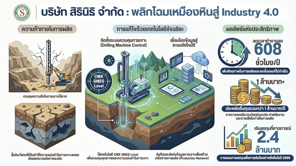 บริษัท สิรินิธิ จำกัด เป็นผู้ประกอบการเหมืองแร่เพื่อผลิตหินใหญ่ป้อนโรงโม่ โดยพบปัญหาการเจาะระเบิดในบริเวณที่มีชั้นดินหรือโพรงจะทำให้แนวการเจาะระเบิดไม่เรียบ ควบคุมความลึกของหลุมเจาะได้ยาก องศาการเจาะไม่เที่ยงตรง ส่งผลต่อการกระจายตัวและขนาดของหินได้ไม่ดี รวมถึงเกิดตอทำให้สูญเสียเวลาและต้นทุนในการระเบิดซ้ำ