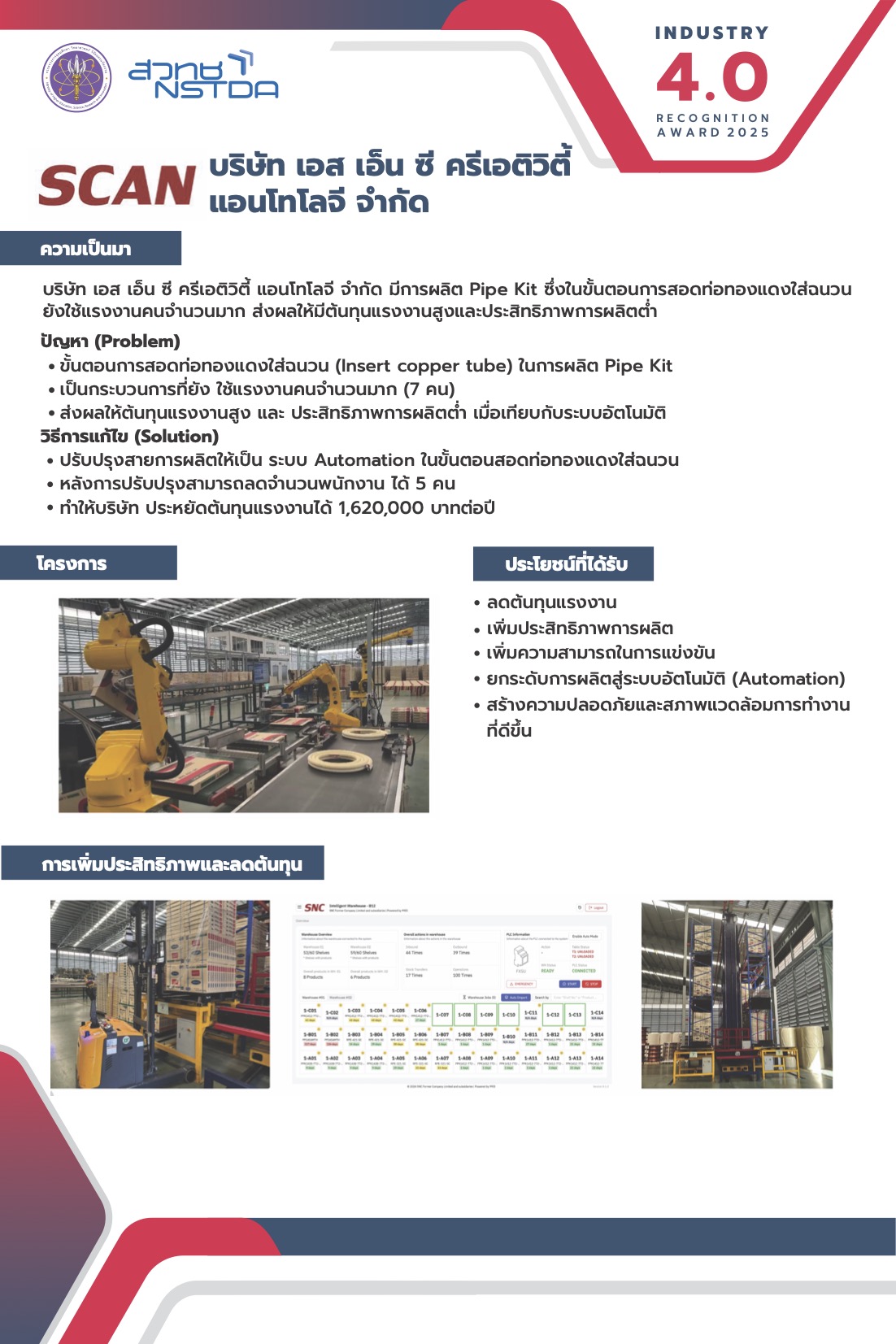บริษัท เอส เอ็น ซี ครีเอติวิตี้ แอนโทโลจี จำกัด มีการผลิต Pipe Kit ซึ่งในขั้นตอนการสอดท่อทองแดงใส่ฉนวน ยังใช้แรงงานคนจำนวนมาก ส่งผลให้มีต้นทุนแรงงานสูงและประสิทธิภาพการผลิตต่ำ