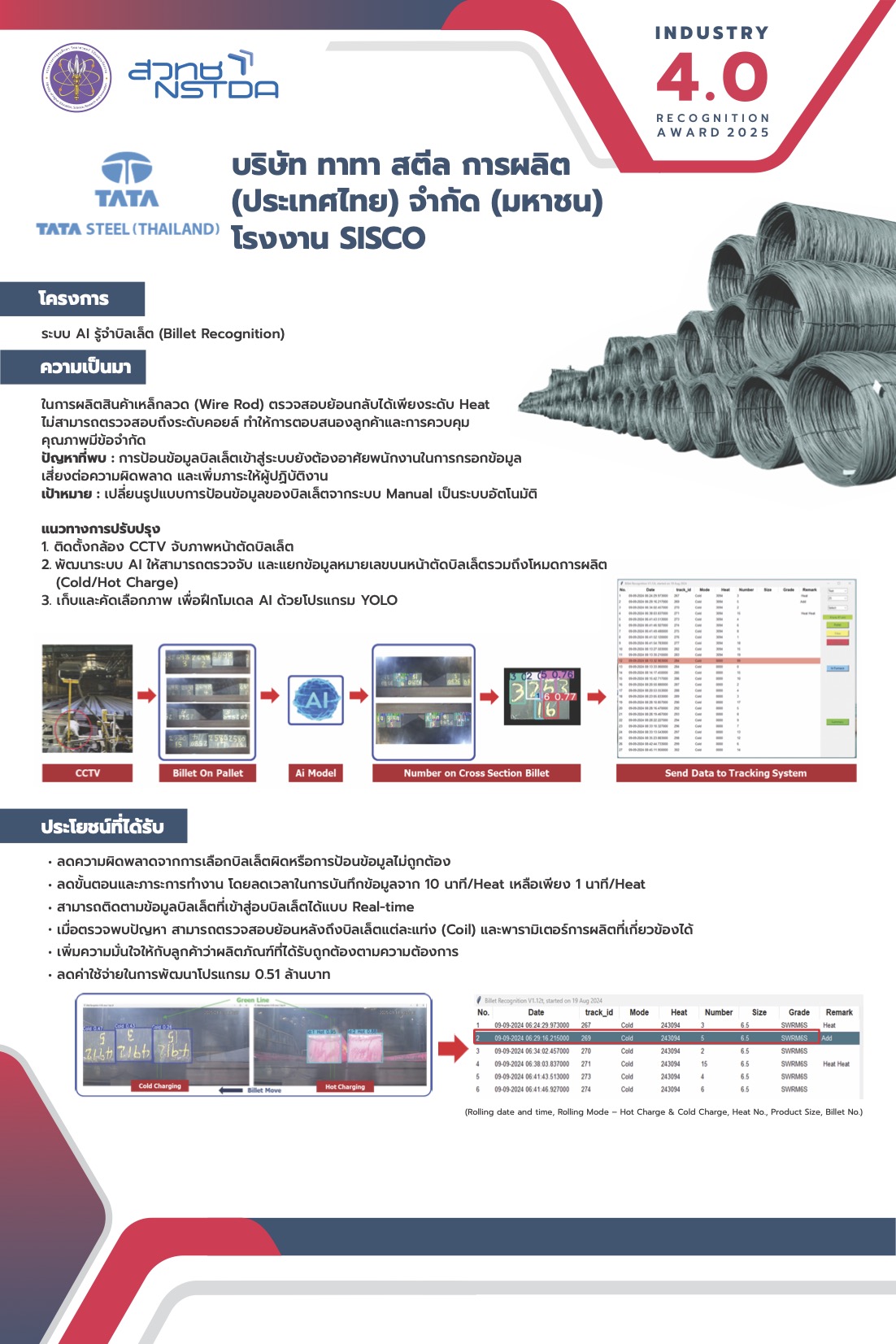 - พัฒนาระบบ AI ให้สามารถตรวจจับ และแยกข้อมูลหมายเลขบนหน้าตัดบิลเล็ตรวมถึงโหมดการผลิต (Cold/Hot Charge)