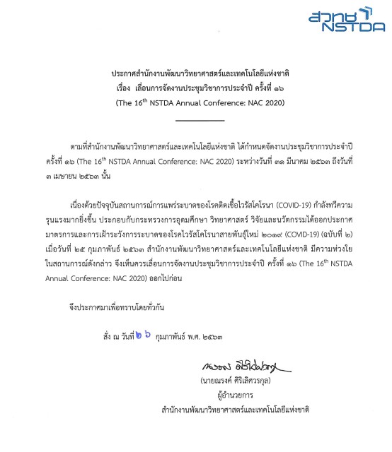 ประกาศ สวทช. เลื่อนการจัดงานประชุมวิชาการประจำปีสวทช. ครั้งที่ 16
