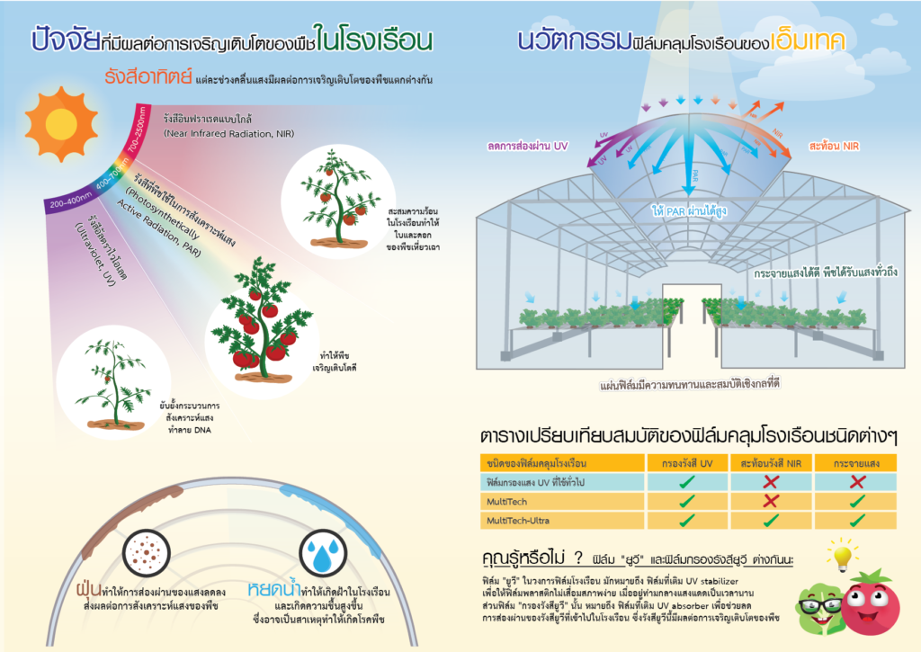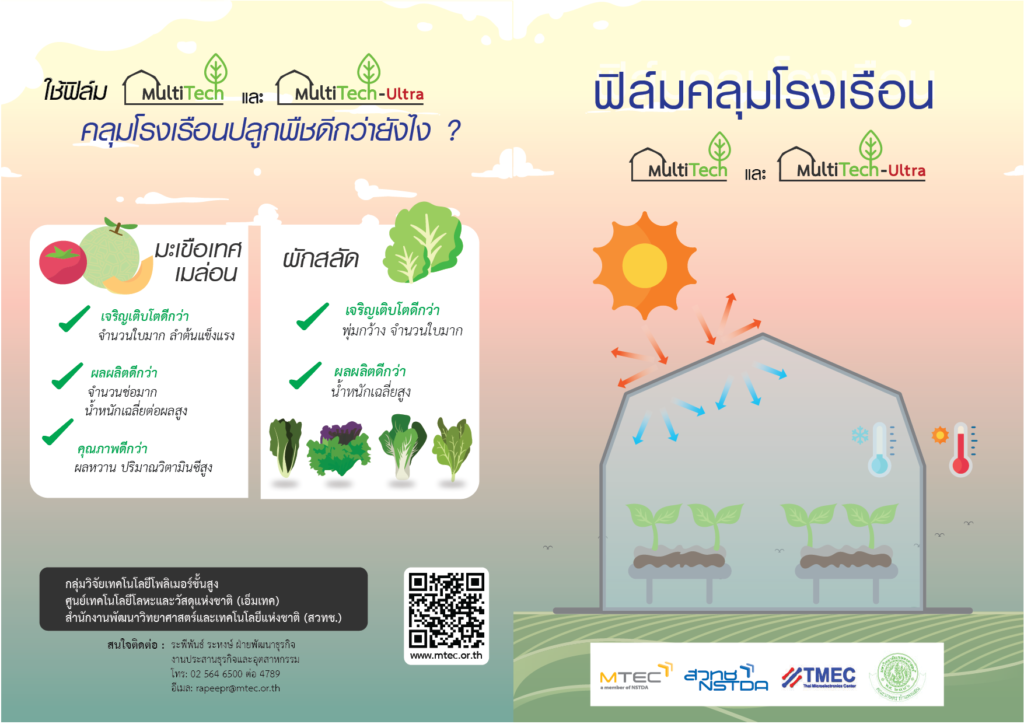 ปัจจุบันฟิล์มคลุมโรงเรือนส่วนใหญ่ที่ผลิตและจำหน่ายในประเทศไทยยังไม่สามารถครอบคลุมความต้องการของเกษตรกรได้ครบถ้วน เพราะพืชแต่ละชนิดมีความต้องการเทคโนโลยีที่แตกต่างกัน อย่างไรก็ตาม ลักษณะของฟิล์มคลุมโรงเรือนที่ดี คือ ฟิล์มที่มีคุณสมบัติกรองรังสี UV ป้องกันรังสีความร้อน กระจายแสงดี และมีอายุการใช้งานที่เหมาะสม ในราคาต้นทุนที่เกษตรกรยอมรับได้ ซึ่งจะช่วยให้พืชเจริญเติบโตได้ดี เพิ่มผลผลิตต่อไร่ และผลิตผลมีคุณภาพสูง ทำให้เกษตรกรสามารถจำหน่ายผลิตผลในราคาที่สูงขึ้นได้ อย่างไรก็ตามฟิล์มคลุมโรงเรือนทางการค้ามักมีสมบัติเพียงอย่างใดอย่างหนึ่งเท่านั้น ดังนั้นนักวิจัยของ MTEC จึงได้วิจัยและพัฒนาฟิล์มคลุมโรงเรือนที่มีสมบัติหลายอย่างในฟิล์มเดียว เช่น ฟิล์ม MultiTech มีสมบัติลดการส่องผ่านของรังสียูวี และกระจายแสงดี ฟิล์ม MultiTech-Ultra มีสมบัติลดการส่องผ่านของรังสียูวี สะท้อนรังสีความร้อน และกระจายแสงดี เพื่อเป็นทางเลือกให้กับเกษตรกรในการเลือกใช้งานให้เหมาะสมกับการเพาะปลูก