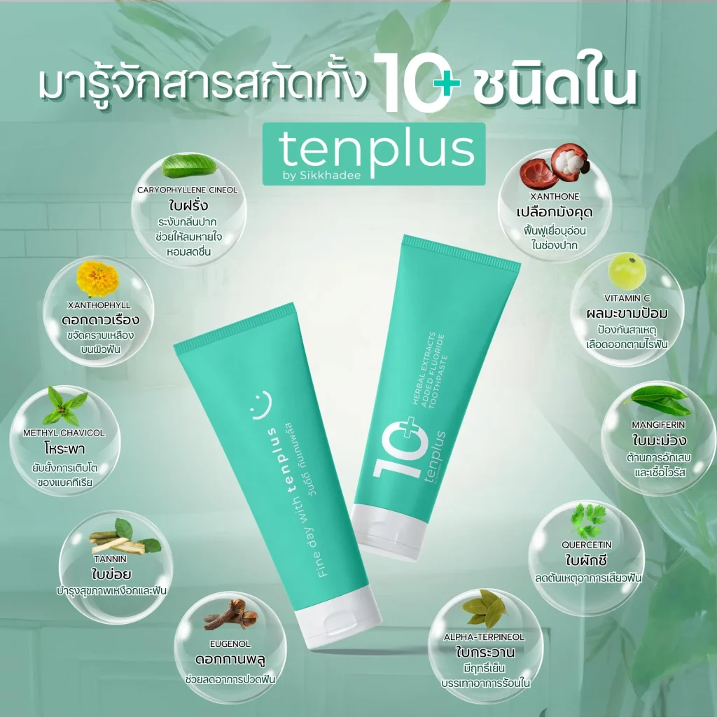 | ผลิตภัณฑ์ : ยาสีฟันสมุนไพรเทนพลัส ยาสีฟันสมุนไพรสิกขาดี จากสารออกฤทธิ์ที่ได้จากสมุนไพรไทย เพื่อสุขภาพในช่องปาก ด้วยการใช้อย่างถูกวิธี เช่น สารออกฤทธิ์จากใบฝรั่ง จะช่วยระงับกลิ่นปาก เป็นต้น ปกป้องดูแลสุขภาพฟัน ปกป้องดูแลสุขภาพเหงือก ช่วยลดกลิ่นปาก ทำให้ปากสะอาดสดชื่น |