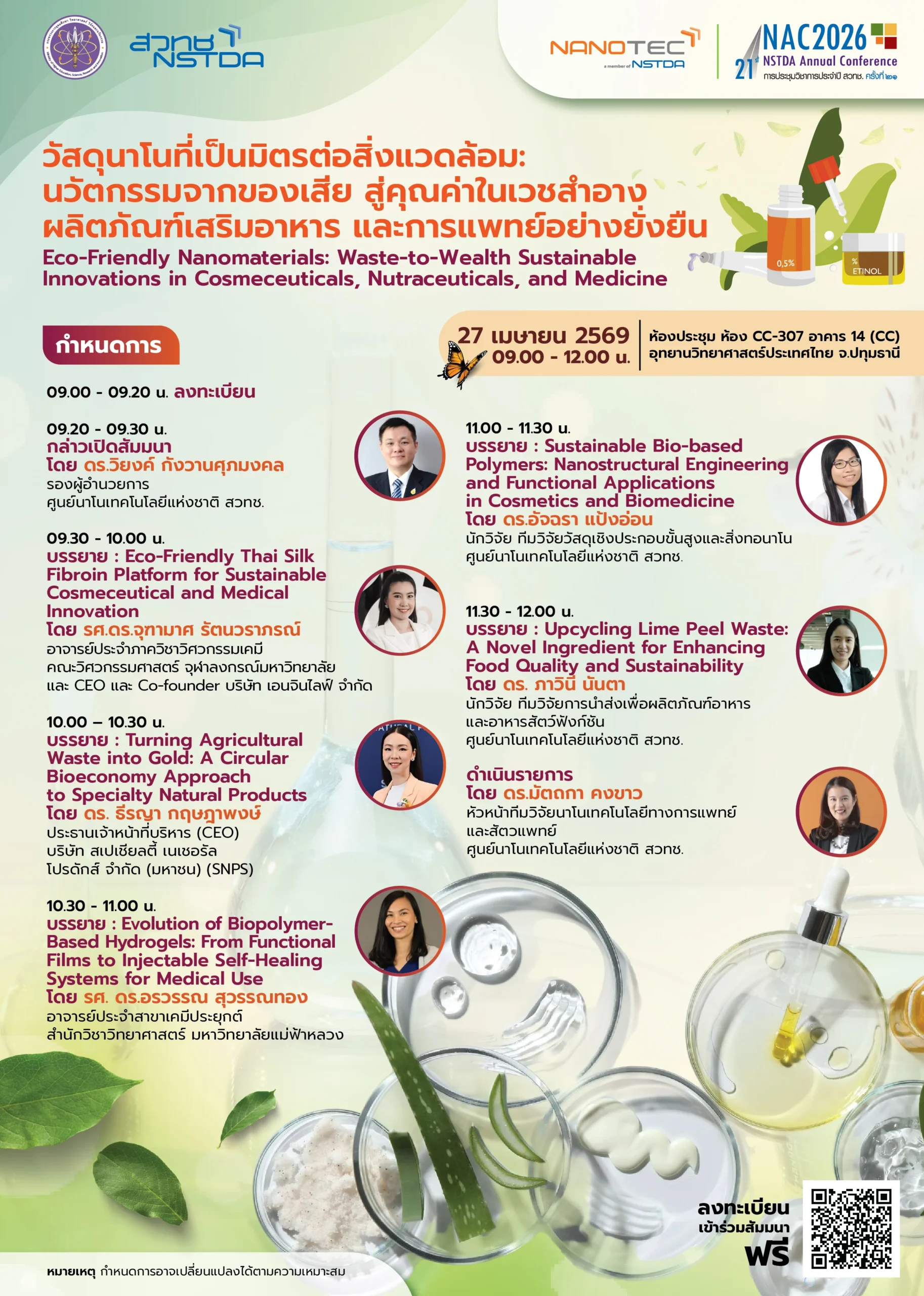 การสัมมนานี้มุ่งเน้นการแลกเปลี่ยนองค์ความรู้และนวัตกรรมด้านวัสดุนาโนที่เป็นมิตรต่อสิ่งแวดล้อม โดยบูรณาการแนวคิด Waste to Wealth และเศรษฐกิจหมุนเวียน ผ่านการนำของเสียจากภาคเกษตร อุตสาหกรรมอาหาร และชีวภาพ มาพัฒนาเป็นวัสดุนาโนและพอลิเมอร์จากธรรมชาติที่มีมูลค่าสูง โดยหัวข้อการบรรยายซึ่งจะครอบคลุมการออกแบบและพัฒนาวัสดุนาโนสำหรับการประยุกต์ใช้ในผลิตภัณฑ์เวชสำอาง (cosmeceuticals) ผลิตภัณฑ์เสริมอาหาร (nutraceuticals) และการแพทย์ (medicine) มุ่งเน้นด้านความปลอดภัย ความสามารถในการย่อยสลาย การลดผลกระทบต่อสิ่งแวดล้อม รวมถึงแนวโน้มด้านกฎระเบียบ มาตรฐาน และโอกาสในการต่อยอดเชิงพาณิชย์ เพื่อขับเคลื่อนนวัตกรรมด้านสุขภาพอย่างยั่งยืนและสร้างคุณค่าทางเศรษฐกิจจากทรัพยากรเหลือทิ้ง
