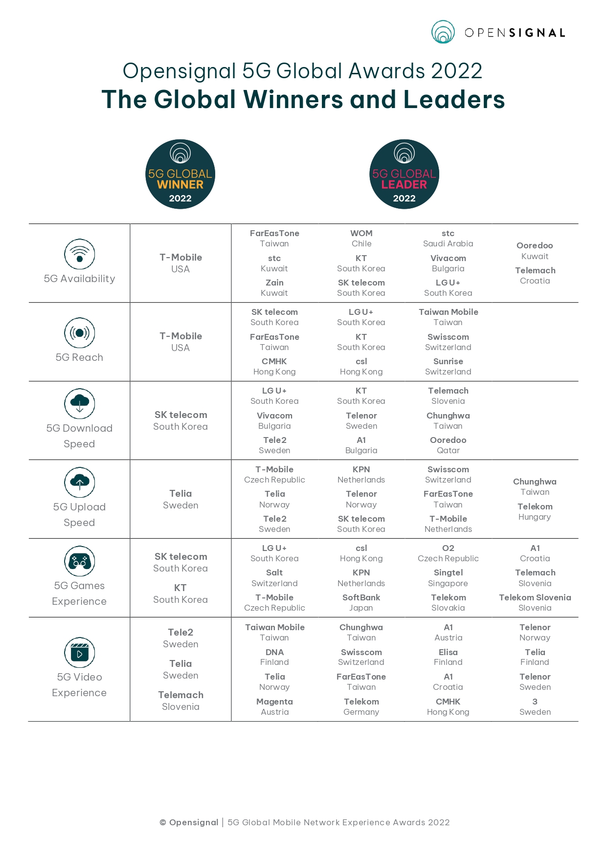 Opensignal เปรียบเทียบประสบการณ์ผู้ใช้งานเครือข่ายมือถือ 5G จากผู้ให้บริการเครือข่ายช่วงครึ่งปีแรกของปี 2565 เพื่อพิจารณาว่าการให้บริการของผู้ให้บริการเครือข่ายทั่วโลกเป็นอย่างไร โดยใช้วิธีการวัดผลประสบการณ์การใช้งานเครือข่าย 5G ตามตัวชี้วัดหลัก 6 ประการ และได้กำหนดผู้ชนะรางวัล 5G ระดับโลก (5G Global Winners) โดยอ้างอิงจากช่วงความเชื่อมั่นเดียวกันกับผลลัพธ์ที่ได้รวบรวมไว้ในรายงานต่าง ๆ หากช่วงความเชื่อมั่นเกิดการทับซ้อนใกล้เคียงกันจะทำให้มีผลลัพธ์ทางสถิติเสมอกัน และจะประกาศให้ผู้ให้บริการเครือข่ายทั้งสองรายเป็นผู้ชนะร่วมกัน นอกจากนี้ Opensignal ยังใช้ช่วงความเชื่อมั่นเป็นตัวชี้วัดเพื่อกำหนดผู้นำการให้บริการ 5G ระดับโลก (5G Global Leaders) และ ผู้ให้บริการ 5G ประสิทธิภาพสูงระดับโลก (5G Global High Performers) ซึ่งประกอบด้วยผู้ให้บริการ 10 อันดับแรกและ 30 อันดับแรกตามลำดับ (ไม่นับรวมผู้ที่ชนะรางวัล 5G Global Winners) โดยในแต่ละหมวดหมู่จะมีจำนวนผู้ชนะแตกต่างกันออกไปเนื่องจากคะแนนของผู้ให้บริการเครือข่ายที่เสมอกันในทางสถิติ