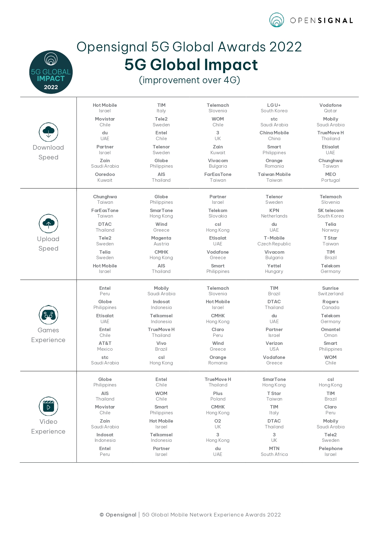 สำหรับรายงานฉบับนี้ถือเป็นครั้งแรกที่ Opensignal ได้เปรียบเทียบว่าประสบการณ์ 5G เปลี่ยนแปลงไปอย่างไรในแต่ละปี และยังได้วิเคราะห์ความแตกต่างระหว่างครึ่งปีแรกของปี 2564 และครึ่งปีแรกของปี 2565 และให้การยอมรับแก่ผู้ให้บริการเครือข่ายที่มีการปรับปรุงประสบการณ์ผู้ใช้งานสูงสุด 20% ใน 5 หมวดหมู่ ได้แก่ ความพร้อมใช้งาน 5G, การเข้าถึง 5G, ความเร็วในการดาวน์โหลด 5G, ความเร็วในการอัปโหลด 5G และประสบการณ์เกม 5G