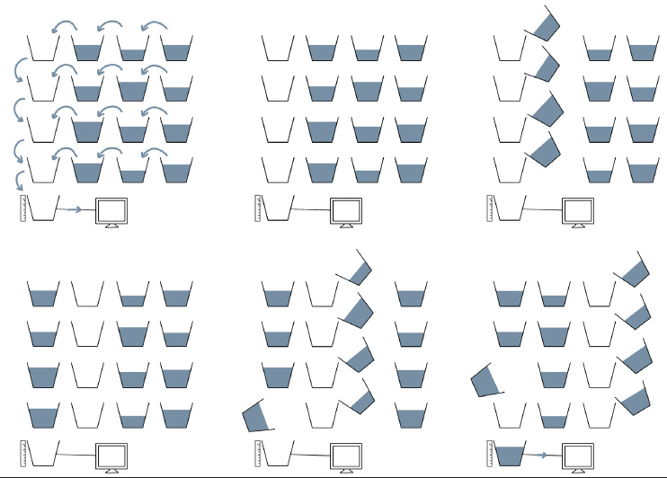 ภาพเปรียบเทียบลำดับการทำงานของพิกเซลใน CCD เข้ากับถังน้ำฝน ดูแบบภาพเคลื่อนไหวได้ที่ https://specinstcameras.com/what-is-a-ccd/