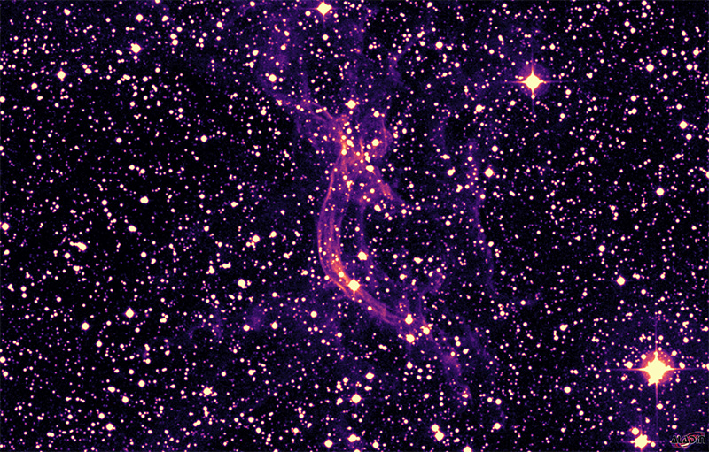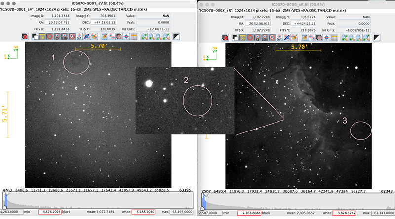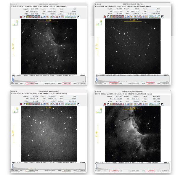 ตัวอย่างภาพที่ถ่ายผ่านฟิลเตอร์ R (red), V (visible light), B (blue), และ H-alpha จะเห็นได้ว่าแสงสีแดงและไฮโดรเจนแอลฟาแสดงให้เห็นโครงสร้างของเนบิวลาชัดเจนที่สุด นั่นเพราะว่าเนบิวลาเป็นแหล่งกำเนิดดาวอันอุดมไปด้วยไฮโดรเจนซึ่งเป็นวัตถุดิบหลักของดาว และแสงที่เปล่งออกเมื่ออิเล็กตรอนของไฮโดรเจนถูกกระตุ้นจากรังสีของดวงดาวโดยรอบนั้นอยู่ในช่วงคลื่นของ H-alpha ที่สอดคล้องกับแสงสีแดงตามที่เรามองเห็น