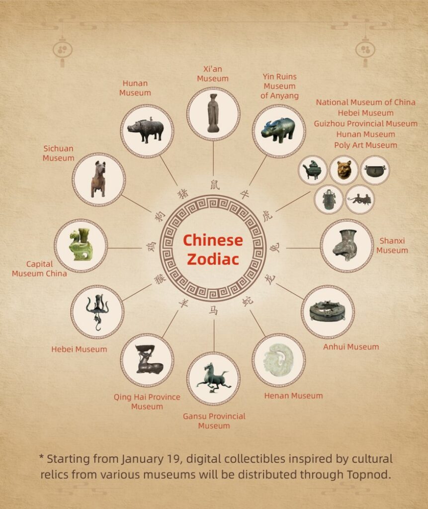 ปีนี้ พิพิธภัณฑ์ 24 แห่งทั่วประเทศจีนเข้าร่วมแคมเปญดังกล่าว พร้อมกับชิ้นงานศิลปะดิจิทัล NFT ซึ่งได้รับแรงบันดาลใจมาจากเสือและโบราณวัตถุตามราศีของคนจีน ชิ้นงานดิจิทัลเหล่านี้ได้รับการส่งเสริมจาก Topnod (鲸探) แพลตฟอร์มจากแอนท์กร๊ป (Ant Group) เพื่อใช้ในการสะสม ค้นหา และแชร์คอลเลกชั่นศิลปะดิจิทัล ก่อนหน้านี้แพลตฟอร์ม Topnod เป็นที่รู้จักในชื่อ “AntChain Fan Points” (蚂蚁链粉丝粒) จากนั้นได้รับการพัฒนาโดยมีฟีเจอร์ใหม่ ๆ รวมถึงการที่มีประสบการณ์ผู้ใช้ที่ดีขึ้น พร้อมการอัพเกรดแบรนด์เมื่อปลายเดือนธันวาคมปี 2564 ที่ผ่านมา