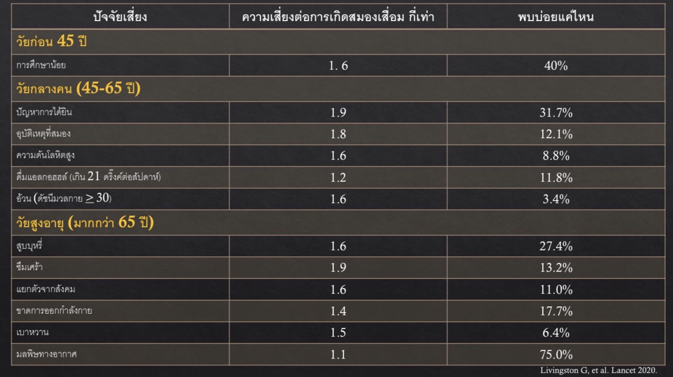 ศาสตราจารย์ นายแพทย์วีรศักดิ์ เมืองไพศาล ภาควิชาเวชศาสตร์ป้องกันและสังคม คณะแพทยศาสตร์ศิริราชพยาบาล มหาวิทยาลัยมหิดล อธิบายว่า อาการสมองเสื่อมมีสาเหตุเกิดได้จากหลายโรค แม้จะป้องกันไม่ได้ 100% จากการ