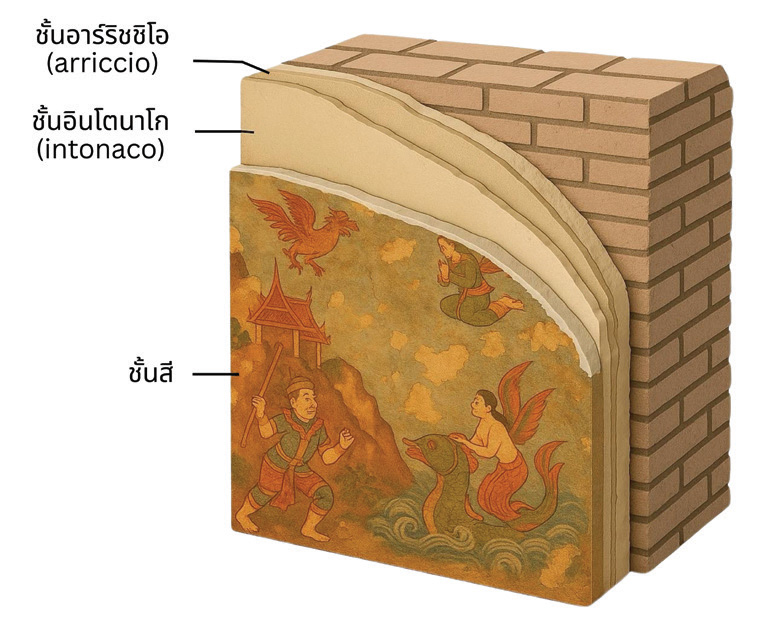 การซ่อมภาพฝาผนังแบบเฟรสโกหรือศิลปะปูนเปียกในสมัยก่อนจะเป็นการลอกภาพออกมาซึ่งยากมาก เพราะการวาดภาพแบบเฟรสโกนี้ต้องระบายสีลงไปในผิวปูนฉาบละเอียดชั้นนอกสุดขณะที่ปูนยังไม่แข็งตัว เรียกว่า อินโตนาโก (intonaco) ระบายไปก็ฉาบไป ทำให้เม็ดสีซึมลึกเข้าไปในเนื้อปูนผิวนอกและยึดติดเป็นเนื้อเดียวกันกับผนัง ไม่ใช่แค่แปะเคลือบอยู่บนผิว เมื่อปูนแห้ง ภาพจึงมีความทนทานสูงและคงอยู่ได้หลายร้อยปี