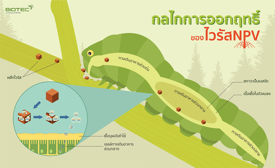 อีกชนิดคือ ไวรัสเอ็นพีวี เมื่อหนอนกินไวรัสเอ็นพีวีที่ปะปนอยู่บนใบพืช ไวรัสเข้าสู่กระเพาะอาหาร ผลึกโปรตีนที่ห่อหุ้มอนุภาคของไวรัสจะถูกย่อยสลายโดยน้ำย่อยในกระเพาะอาหารซึ่งมีฤทธิ์เป็นด่าง อนุภาคไวรัสจะหลุดออกมาและเข้าทำลายเซลล์กระเพาะอาหารของหนอน ทำให้หนอนกินอาหารลดลง เคลื่อนไหวช้าลง ผนังลำตัวสีเขียวของหนอนจะเริ่มซีดจาง หลังจากนั้นอนุภาคไวรัสขยายเพิ่มจำนวนมากขึ้นและแพร่กระจาย เข้าไปทำลายเซลล์ต่าง ๆ ทั่วลำตัวของหนอน ผนังลำตัวของหนอนจะเปลี่ยนเป็นสีขาวหรือสีครีม หนอนหยุดกินอาหาร พยายามไต่ขึ้นบริเวณส่วนยอดของต้นพืช และตายโดยห้อยหัวและส่วนท้องลงเป็นรูปตัว “วี” (V) หัวกลับ ผนังลำตัวของหนอนที่ตายแล้วจะแตกง่ายและจะเปลี่ยนเป็นสีดำอย่างรวดเร็ว ของเหลวภายในซากหนอนจะเต็มไปด้วยผลึกของไวรัส