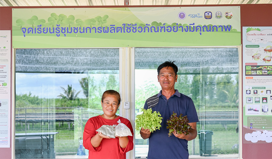 คุณวิฑูรย์ ปรางโรจน์ ประธานวิสาหกิจชุมชนผักสุมหัว อำเภอพนมทวน จังหวัดกาญจนบุรี และคุณอุไรพร เบ็ญพาด ภรรยา มีโอกาสเข้าร่วมโครงการกับ สท. ในโครงการถ่ายทอดเทคโนโลยีการผลิตและใช้ชีวภัณฑ์ที่มีคุณภาพและมาตรฐานสู่เกษตรกร ทั้งสองได้เรียนรู้ทฤษฎี ฝึกปฏิบัติผลิตชีวภัณฑ์ (บิวเวอเรีย เมตาไรเซียม ไส้เดือนฝอย) และทดสอบวิธีกำจัดศัตรูพืชด้วยชีวภัณฑ์เปรียบเทียบกับวิธีของตนในแปลงผักกวางตุ้ง ผลลัพธ์ที่ได้ คือ แมลงศัตรูพืชลดน้อยลง ผลผลิตสมบูรณ์และได้น้ำหนัก ทำให้เชื่อมั่นการใช้ชีวภัณฑ์จากเชื้อสดที่ผลิตไว้ใช้งานเอง จึงลงทุนสร้างอาคารประชุมและห้องผลิตขยายชีวภัณฑ์ 3 ห้อง ได้แก่ ห้องผลิตเชื้อราบิวเวอเรีย ห้องผลิตเชื้อราเมตาไรเซียมและห้องผลิตไส้เดือนฝอย โดยคุณอุไรพรรับหน้าที่ผลิตชีวภัณฑ์ให้สอดคล้องกับแผนการผลิตผักของคุณวิฑูรย์ เธอสามารถผลิตเชื้อราบิวเวอเรียและเชื้อราเมตาไรเซียมคุณภาพ มีสปอร์ไม่ต่ำกว่า 109 สปอร์/กรัม และเปอร์เซ็นต์การงอกเฉลี่ยไม่ต่ำกว่า 95 เปอร์เซ็นต์