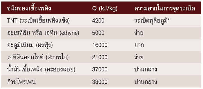 อันที่จริงแล้วพลังงานความร้อน Q ที่ปล่อยออกมาจากการระเบิดของอากาศผสมเชื้อเพลิงนั้นมีค่ามากกว่าพลังงานจากการระเบิดของวัตถุระเบิดที่อัดแน่นอย่างทีเอ็นทีมาก ดังตารางเปรียบเทียบความร้อนที่ได้จากการระเบิดของวัตถุระเบิดชนิดต่าง ๆ ดังนี้