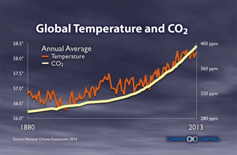 รูปที่ 1 ระดับคาร์บอนไดออกไซด์ที่เพิ่มขึ้น และอุณหภูมิเฉลี่ยตั้งแต่ปี ค.ศ. 1880 – 2013 ซึ่งเพิ่มจาก 56 oF (13.33 oC) ขึ้นมาเป็น 58.5 oF (14.72 oC) (ที่มา : [1])