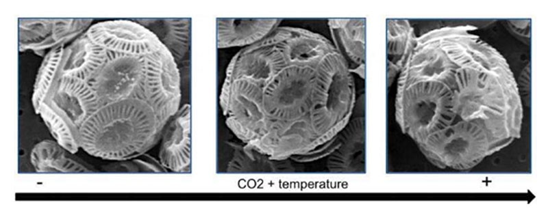 แต่จากการที่มี CO2 มากเกินไปในบรรยากาศ ส่วนที่ละลายลงมหาสมุทร กลับทำให้มหาสมุทรเป็นกรด สิ่งนี้จะทำให้ความสามารถในการดูดซับคาร์บอนไดออกไซด์จากบรรยากาศของแพลงก์ตอนเหล่านี้ลดลง เพราะส่วนค็อกโคลิท (coccolith) ซึ่งเป็นแผ่นแคลเซียมคาร์บอเนตที่เป็นเปลือกของแพลงก์ตอนพวกนี้เปลี่ยนแปลงรูปร่างไป (อ่านเกี่ยวกับค็อกโคลิทได้ใน https://www.thwiki.press/wiki/Coccoliths) ซึ่งจากการศึกษาของทีมวิจัยร่วมจากสถาบันวิทยาศาสตร์และเทคโนโลยีสิ่งแวดล้อมของมหาวิทยาลัย Universitat Autònoma de Barcelona (ICTA-UAB) ประเทศสเปน มหาวิทยาลัยเคมบริดจ์ของอังกฤษ และสมาคมชีววิทยาทางทะเลแห่งสหราชอาณาจักร พบว่าสาหร่ายในกลุ่ม Coccolithophores ซึ่งเป็นแพลงก์ตอนกลุ่มใหญ่ในแพลงก์ตอนที่มีเปลือกหินปูนนั้น เมื่อศึกษาด้วยการส่องด้วยกล้องจุลทรรศน์อิเล็กตรอนแบบส่องกราด (SEM) ภาพถ่ายแพลงก์ตอนแสดงให้เห็นลักษณะของค็อกโคลิทที่ไม่สมบูรณ์และผิดรูปร่างไปมากขึ้นเรื่อยๆ ตามอุณหภูมิที่สูงขึ้น และความเป็นกรดที่มากขึ้นของมหาสมุทร สิ่งนี้ทำให้นักวิจัยกังวลถึงปัญหาที่จะเกิด แม้ในปัจจุบันการวิจัยยังไม่ได้ศึกษาปัจจัยเรื่องอัตราการตกตะกอนของพวกมันที่จะจมลงไปที่ก้นทะเลในภาคสนาม แต่จากการคำนวณในคอมพิวเตอร์โดยนำเอารูปร่างของแพลงก์ตอนที่เปลี่ยนไปมาคิด ก็พบว่าอัตราการตกตะกอนจะเร็วขึ้นเมื่อน้ำทะเลอุ่นขึ้นอีกด้วย ซึ่งเรื่องนี้เป็นเรื่องสำคัญมากต่อประชากรแพลงก์ตอน เนื่องจากอัตราการอยู่รอดของพวกมันจะขึ้นกับอัตราการจมลงไปในน้ำของพวกมัน ซึ่งมันจำเป็นต้องอยู่ในโซนของระดับน้ำที่ไม่ลึกมากและยังมีแสงส่องทะลุลงไปถึง ในบริเวณความลึกที่มันยังสังเคราะห์แสงได้นั่นเอง ซึ่งหากมันจมลงไปลึกกว่านั้น มันจะสังเคราะห์แสงไม่ได้และตาย