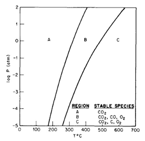 รูปที่ 3 การเผา CO2 ที่อุณหภูมิและความดันต่างๆ โดยในโซน A จะยังไม่เกิดการสลายตัวของ ส่วนในโซน B CO2 จะเกิดการสลายตัวบางส่วน กลายเป็นคาร์บอนมอนอกไซด์และออกซิเจน ส่วนในโซน C ผลิตภัณฑ์ที่ได้คือ คาร์บอนและออกซิเจน (ที่มา : [6])