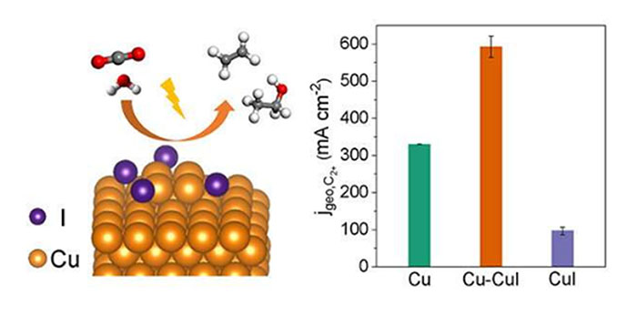 รูปที่ 4 ภาพแสดงการใช้ตัวเร่งปฏิกิริยาที่ประกอบด้วยอนุภาคนาโนทองแดงและผงคอปเปอร์ไอโอไดด์ (CuI) ซึ่งสามารถเพิ่มประสิทธิภาพในการเกิดปฏิกิริยา CO2RR ทำให้มีอัตราการเปลี่ยนคาร์บอนไดออกไซด์เป็นสารผลิตภัณฑ์ที่มีคาร์บอนสองตัวขึ้นไปมากยิ่งขึ้น (ที่มา : [10])