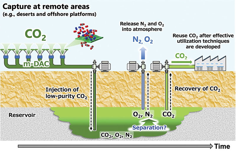ตามที่กล่าวมา จะเห็นว่ามีหลายแนวคิด หลายวิธีทีเดียว ที่มีการคิดค้นเพื่อแปลงสภาพคาร์บอนไดออกไซด์ให้เป็นเชื้อเพลิงหรือสารอื่นๆ เพื่อใช้ในอุตสาหกรรม แต่นอกเหนือจากนี้ก็มีแนวคิดจากกลุ่มนักวิจัยจากมหาวิทยาลัยคิวชู และสถาบัน National Institute of Advanced Industrial Science and Technology ประเทศญี่ปุ่น[14] ซึ่งได้ลองคำนวณจำลองผลการดูดอากาศปกติ ผ่านกระบวนการที่เรียกว่า direct air capture (DAC) ซึ่งเป็นกระบวนการที่ใช้อยู่ในอุตสาหกรรมในการดึงเอาคาร์บอนไดออกไซด์ความเข้มข้นสูงจากจุดปล่อย เช่น โรงปูนซีเมนต์ หรือโรงไฟฟ้าชีวมวล โดยการนำไปผ่านลงในสารละลายด่าง เช่น โพแทสเซียมไฮดรอกไซด์ หรือตัวดูดซับอื่นๆ ที่ใช้ได้ เพื่อดูด CO2 ออก จากนั้นก็ให้ความร้อนเมื่อต้องการปล่อย CO2 ที่ดักได้ออกมา นักวิจัยต้องการใช้กระบวนการนี้ ดูดเอา CO2 ไปอัดเก็บไว้ในบ่อใต้ดิน แต่เปลี่ยนจากการดูดซับในสารละลาย เป็นการกรองโดยใช้เยื่อเมมเบรนแบบที่เลือกชนิดของก๊าซที่ซึมผ่านได้(permselective membranes) โดยเสนอให้ตั้งโรงงานแยกก๊าซนี้ในที่ห่างไกลจากชุมชน เพียงแต่หากดูดเอาอากาศทั่วไปโดยตรงอย่างที่นักวิจัยเสนอ แทนที่จะเป็นก๊าซจากปล่องไอเสียหรือเตาเผาของโรงงานอุตสาหกรรม ก๊าซที่ได้มาอาจจะไม่บริสุทธิ์นัก เนื่องจากมี CO2 น้อย และจะมีออกซิเจนและไนโตรเจนจากอากาศปกติติดมาด้วย เพราะเยื่อเมมเบรนน่าจะมีประสิทธิภาพไม่ถึง 100 เปอร์เซ็นต์ กลุ่มวิจัยจึงเสนอให้อัดก๊าซที่ดูดได้ด้วย DAC เข้าไปเก็บในแหล่งกักเก็บใต้ดิน ซึ่งเป็นโพรงขนาดใหญ่ที่อาจเป็นแท่นขุดเจาะต่างๆ ที่เคยดูดเอาปิโตรเลียมขึ้นมาใช้ ซึ่งปัจจุบันนี้ก็มีการใช้การอัดก๊าซ CO2 เข้าไปในช่องว่างของชั้นหินเพื่อทดแทนปิโตรเลียมที่ขุดขึ้นมาอยู่แล้ว โดยเสนอว่าอาจหาวิธีใดวิธีหนึ่งในการแยกเอาออกซิเจนและไนโตรเจนขึ้นมาตามท่อเพื่อปล่อยกลับออกสู่บรรยากาศ และแยกเอา CO2 ออกไปอีกทางหนึ่ง ดังรูปที่ 5 ทั้งนี้ในรายงานวิจัย ทีมวิจัยยังได้หยิบยกกรณีตัวอย่างด้วยว่าเกือบ 95 เปอร์เซ็นต์ของคาร์บอนไดออกไซด์ที่ถูกอัดฉีดเข้าไปในชั้นหินบะซอลต์ที่เกาะไอซ์แลนด์โดยบริษัทสตาร์ตอัปชื่อ CarbFix ที่บิลเกตส์สนับสนุน ซึ่งสำนักงานตั้งอยู่ที่นครเรคยาวิก (Reykjavík) ได้กลายเป็นหินแร่คาร์บอเนตภายในเวลา 2 ปีเท่านั้น (https://www.carbfix.com/) และยังอ้างอิงถึงการคาดคะเนเอาไว้ว่า หากเก็บกักในหมู่เกาะญี่ปุ่น CO2 แค่เพียงในญี่ปุ่นก็มีความจุในการกักเก็บ CO2 ถึง 100 กิกะตัน (Gt) แล้ว ซึ่งเทียบเท่ากับปริมาณการปลดปล่อย CO2 ที่ญี่ปุ่นปล่อยออกมาสู่บรรยากาศเป็นเวลาถึง 100 ปีทีเดียว