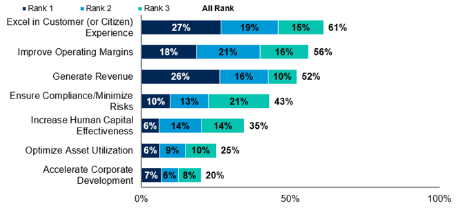 จากการสำรวจพบว่า ความเป็นเลิศด้านประสบการณ์ลูกค้าหรือพลเมือง ช่วยเพิ่มผลกำไรจากการดำเนินงานและสร้างรายได้ ซึ่งเป็นผลลัพธ์สำคัญที่สุดจากการลงทุนเทคโนโลยีดิจิทัล (ดูรูปที่ 2)