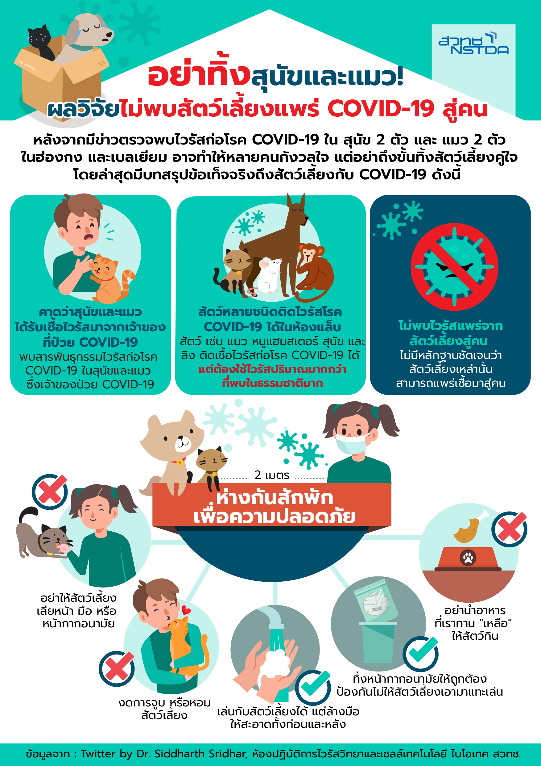“นอกจากนี้ยังมีการทดลองในห้องปฏิบัติการ โดยการนำเชื้อไวรัส SARS-CoV-2 ทดสอบการติดเชื้อในสัตว์หลายประเภท คือ แมว หนูแฮมสเตอร์ เฟอร์เร็ต สุนัข และลิง พบว่า สัตว์เหล่านี้สามารถติดเชื้อไวรัส SARS-CoV-2 ได้ แต่มีความสามารถแพร่เชื้อได้ไม่เท่ากัน เช่น สุนัขแพร่เชื้อได้น้อยกว่าแมวและหนูแฮมสเตอร์ เป็นต้น แต่ทั้งนี้อย่าลืมว่าการทดลองในห้องปฏิบัติการดังกล่าวมีการใช้เชื้อไวรัสเพื่อทำให้สัตว์ติดเชื้อในปริมาณที่สูงมาก และสูงเกินกว่าที่จะพบได้ในสภาวะปกติหรือในธรรมชาติทั่วไป แต่สิ่งที่สำคัญคือ แม้สัตว์เหล่านี้จะติดเชื้อไวรัสได้ แต่ยังไม่มีหลักฐานใดๆ ที่ยืนยันว่า สัตว์เหล่านี้สามารถแพร่เชื้อไวรัสก่อโรค COVID-19 มาสู่คน เนื่องจากสัตว์ไม่มีอาการป่วยเหมือนในคน หรืออาจเพราะปริมาณไวรัส SARS-CoV-2 ในสัตว์เลี้ยงมีปริมาณน้อยมากๆ จนไม่สามารถแพร่สู่คนได้”