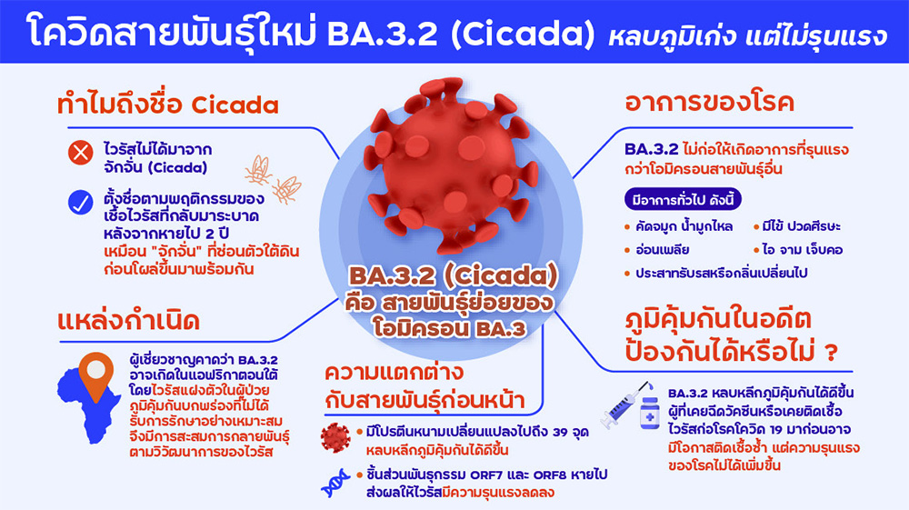ข่าวการระบาดของเชื้อไวรัสก่อโรคโควิด 19 หรือ SARS-CoV2 สายพันธุ์ย่อยใหม่ที่ชื่อว่า BA.3.2 หรือ Cicada (แปลว่า จักจั่น) ในหลายประเทศทั้งอเมริกา ยุโรป และแอฟริกา ส่งผลให้ศูนย์ควบคุมและป้องกันโรคแห่งชาติสหรัฐอเมริกา (CDC) และองค์การอนามัยโลกเร่งจับตาและเฝ้าระวังอย่างใกล้ชิด คำถามสำคัญคือ ไวรัสสายพันธุ์นี้มีที่มาอย่างไร มีความรุนแรงต่างจากสายพันธุ์ในอดีตมากน้อยแค่ไหน และสะท้อนให้เห็นถึงทิศทางการวิวัฒนาการของเชื้อไวรัสก่อโรคโควิด 19 ในระยะต่อไปอย่างไรบ้าง