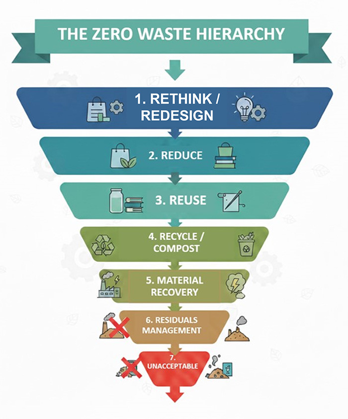 Zero Waste คือ “เป้าหมายและหลักการ” แปลตรงตัวว่า ขยะเป็นศูนย์ แต่ในความหมายจริงไม่ได้แปลว่าโลกนี้จะไม่มีขยะเลย แต่หมายถึง การออกแบบการใช้ชีวิตและการผลิตสินค้าให้เหลือขยะน้อยที่สุด และพยายามนำของที่ใช้แล้วกลับมาใช้ซ้ำหรือรีไซเคิลให้มากที่สุด ผ่านหลักการ 7R หรือลำดับขั้นการจัดการขยะ (Zero Waste Hierarchy) โดยให้ความสำคัญกับการป้องกันที่ต้นเหตุเพื่อลดผลกระทบต่อสิ่งแวดล้อมให้ได้มากที่สุด โดยเรียงลำดับจากสิ่งที่ควรทำมากที่สุดไปหาทางออกสุดท้ายได้ดังนี้