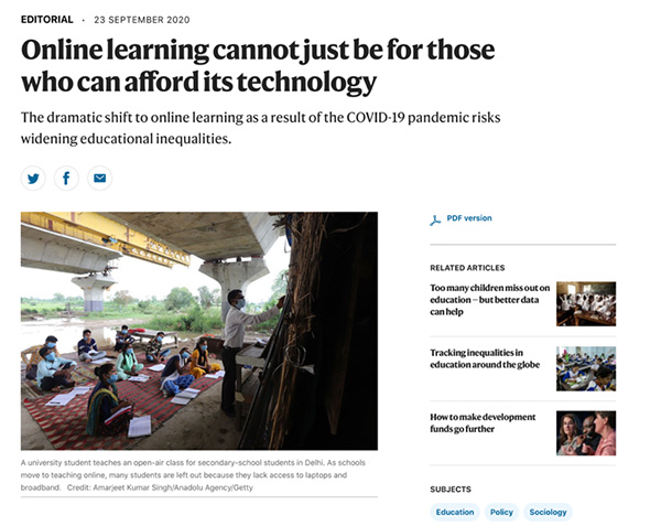 หน้าบทบรรณาธิการของวารสาร nature บนเว็บ ลงวันที่ 23 กย 2563 พาดหัวไว้อย่างชัดเจน เทคโนโลยีการเรียนออนไลน์ไม่ใช่จะสักแต่ว่าทำให้ผู้ที่สามารถจ่ายได้!