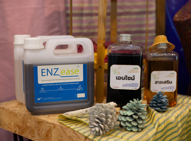 การใช้เอนไซม์สำหรับงานสิ่งทอ เป็นเทคโนโลยีที่ สท. ได้ร่วมกับทีมวิจัยเทคโนโลยีเอนไซม์ ศูนย์พันธุวิศวกรรมและเทคโนโลยีชีวภาพแห่งชาติ (ไบโอเทค) สวทช. นำไปถ่ายทอดให้ชุมชน ซึ่งทีมวิจัยไบโอเทคได้พัฒนาเทคโนโลยีเอนไซม์เอนอีซ (ENZease) และเอนไซม์ซิลค์โปร (SilkPro) ที่ยกระดับกระบวนการผลิตเส้นใยฝ้ายและเส้นใยไหม มีขั้นตอนการใช้งานที่ง่าย ประหยัดเวลา ลดการใช้สารเคมี ปลอดภัยต่อผู้ใช้และสิ่งแวดล้อม การใช้เอนไซม์ยังทำให้เส้นใยที่ได้แข็งแรง มีคุณภาพ และติดสีดีเมื่อนำไปย้อม โดยเอนไซม์เอนอีซ (ENZease) ลอกแป้งและกำจัดสิ่งสกปรกบนเส้นใยฝ้ายและผ้าฝ้ายในขั้นตอนเดียว ทดแทนการใช้สารเคมีได้