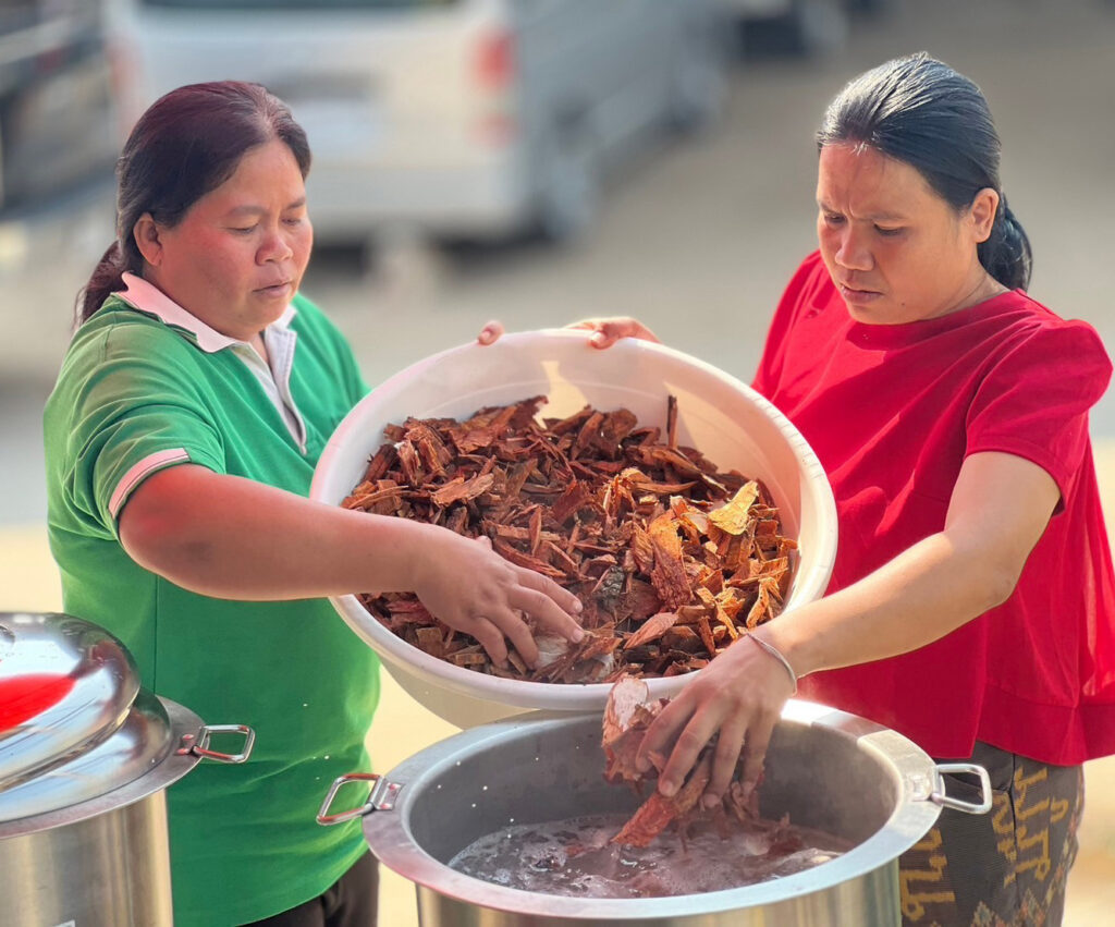 “แต่ก่อนเราจะย้อมครั่ง ก็ย้อมเลย ไม่เคยรู้การใช้มอร์แดนต์และการฟิกซ์ (fix) สีมาก่อน รู้แค่ว่าถ้าอยากได้สีเข้มให้ใส่น้ำด่าง ย้อมครั่งแต่ละช่วงเวลาให้สีต่างกัน แต่พอได้มาอบรม ทำให้เราย้อมไหมครั้งเดียวแต่ได้หลายสี อย่างย้อมไหม 6 ปอย เราแบ่งไหม 2 ปอยไปฟิกซ์สีกับน้ำปูนใส อีก 2 ปอยฟิกซ์สีกับสารส้ม ที่เหลือฟิกซ์สีกับสนิม แล้วยังได้เทคนิคทอไล่เฉดสี เพิ่มลูกเล่นลวดลายผ้าจากการขิด การจก เป็นความรู้ใหม่ที่ช่วยพัฒนางานผ้าของเราได้มาก” สุภา อิ่มบุตร ประธานกลุ่มทอผ้าแม่สุภาผ้าไทย ตำบลทุ่งหลวง อำเภอสุวรรณภูมิ จังหวัดร้อยเอ็ด เล่าถึงองค์ความรู้การใช้มอร์แดนต์ (mordant) สารช่วยสีติดจากธรรมชาติที่ช่วยให้เส้นใยติดสีได้ดีขึ้น