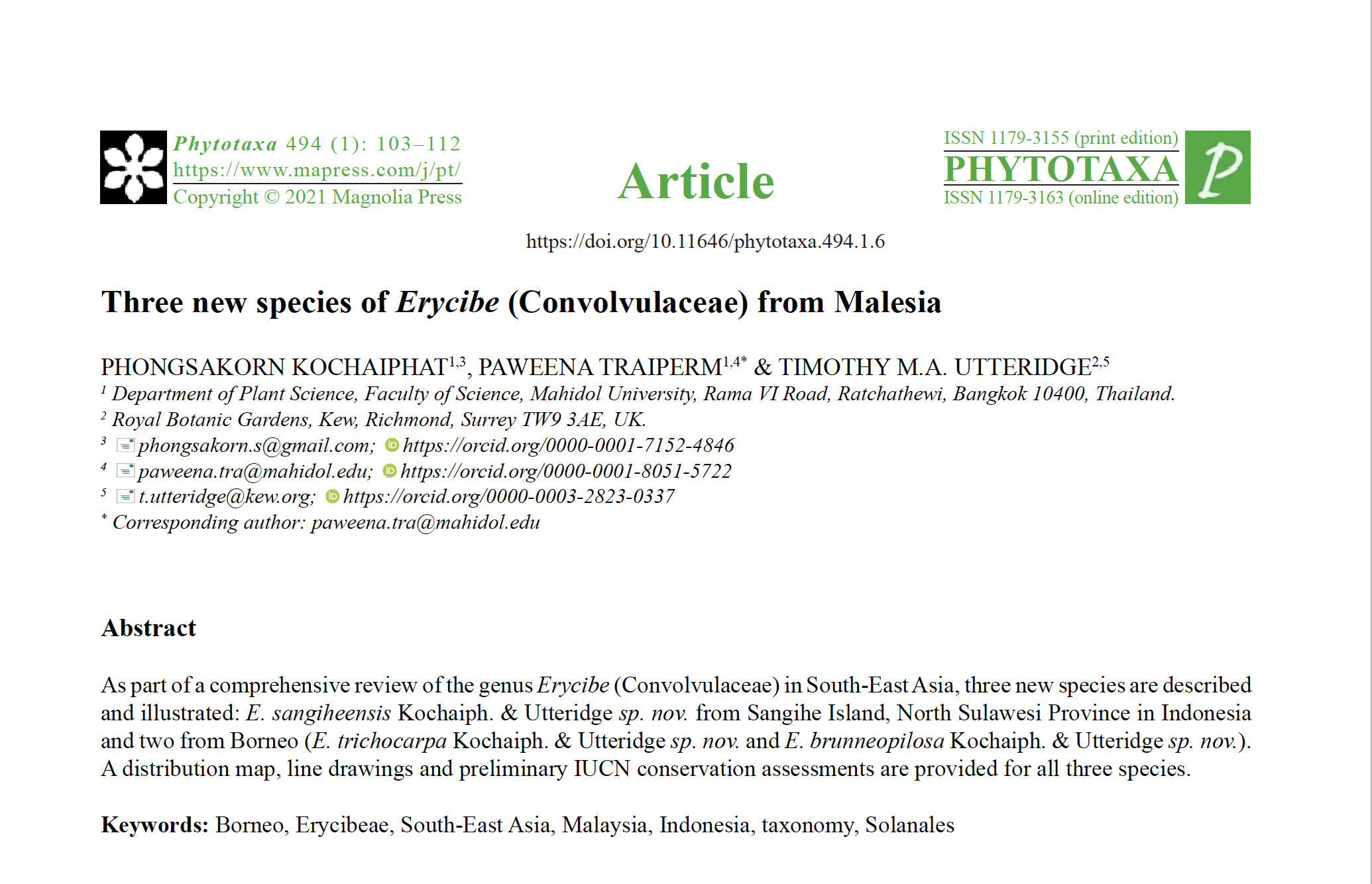 บทความวิชาการได้รับการตีพิมพ์ใน Phytotaxa
