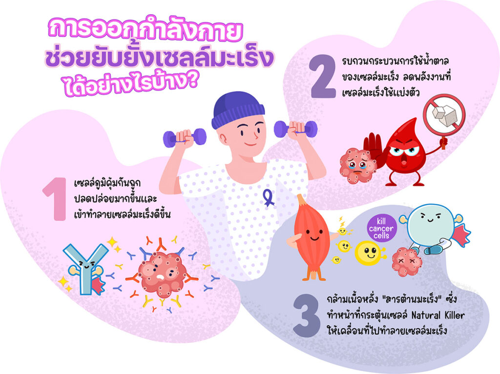 ในอดีตมักเชื่อกันว่าผู้ป่วยมะเร็งไม่ควรออกกำลังกาย เพราะอาจมีผลเสียทำให้ร่ายกายยิ่งอ่อนเพลีย ผู้ป่วยควรพักผ่อนให้มากที่สุดเพื่อสงวนพลังงานไว้ต่อสู้กับโรค แต่ว่าในช่วงไม่กี่ปีที่ผ่านมามีผลวิจัยจำนวนมากชี้ให้เห็นว่า “การออกกำลังกาย” อย่างเหมาะสมในผู้ป่วยมะเร็งไม่เพียงเป็นส่วนเสริมสร้างความแข็งแรงทั้งกาย-ใจในการต่อสู้กับโรคร้าย แท้จริงแล้วยังมีศักยภาพเป็น “ยาขนานใหม่” ที่ส่งผลทำลายเซลล์มะเร็งอีกด้วย