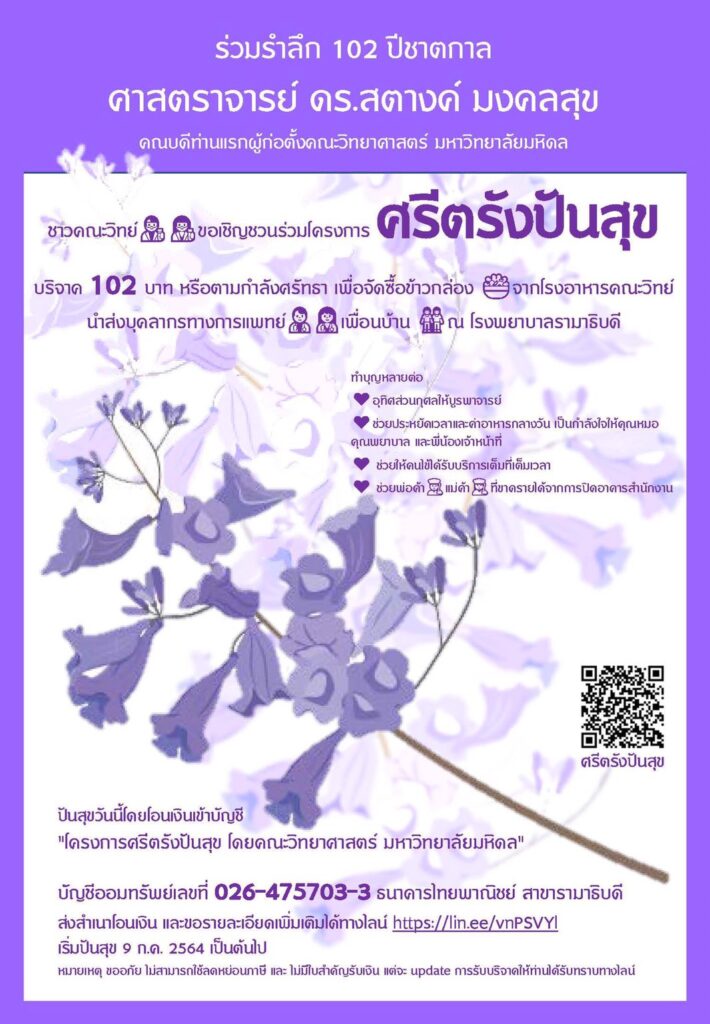รองศาสตราจารย์ ดร.พลังพล คงเสรี กล่าวต่อไปว่า ค่าใช้จ่ายในการจัดทำอาหารกล่องตกประมาณวันละ 5,000 – 7,000 บาท ซึ่งนอกจากรับเป็นเงินบริจาคแล้ว ผู้สนใจยังสามารถร่วมบริจาคเป็นน้ำดื่ม ขนม ผลไม้ ฯลฯ โดย คณะวิทยาศาสตร์ มหาวิทยาลัยมหิดล พร้อมทำหน้าที่เป็นสื่อกลางในการนำไปมอบแก่บุคลากรทางการแพทย์ ตามโครงการ “ศรีตรังปันสุข” ที่เปิดโอกาสให้ทุกคนได้หันมาดูแลซึ่งกันและกัน ให้สามารถผ่านพ้นช่วงเวลาที่ยากลำบากนี้ และนอกจากนี้ ทางคณะฯ ยังมีโครงการจะให้ครัวคณะวิทย์บางร้านได้จัดทำอาหารเพื่อผู้ป่วยของโรงพยาบาลรามาธิบดี ในกลุ่มสีเขียว ที่ต้องกักโรค (Home Isolation) ตลอด 3 มื้อต่อวัน ร่วมบริจาคได้ที่ บัญชีออมทรัพย์เลขที่ 026-475703-3 ธนาคารไทยพาณิชย์ จำกัด (มหาชน) สาขารามาธิบดี ชื่อบัญชี “โครงการศรีตรังปันสุข โดยคณะวิทยาศาสตร์ มหาวิทยาลัยมหิดล” ติดตามรายละเอียดได้ที่ Facebook : Mahidol University, Faculty of Science