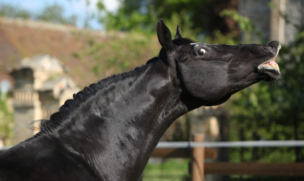 บางครั้งเราเห็นม้าแยกเขี้ยวยิงฟันเหมือนมันกำลังหัวเราะหรือแสยะยิ้มนั้น จริง ๆ แล้วเป็นปฏิกิริยาที่เกิดขึ้นหลังจากที่ประสาทรับกลิ่นซึ่งอยู่แถวเพดานปากของม้าจับกลิ่นฟีโรโมนหรือกลิ่นบางอย่างได้ ปฏิกิริยาแสยะยิ้มยิงฟันนี้เรียกว่า Flehmen response นอกจากม้าแล้วยังมีสัตว์เลี้ยงลูกด้วยนมบางพวก เช่น แมว เสือ สมเสร็จ ควาย ที่แสยะยิ้มได้เช่นกัน