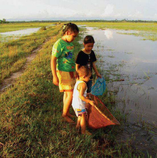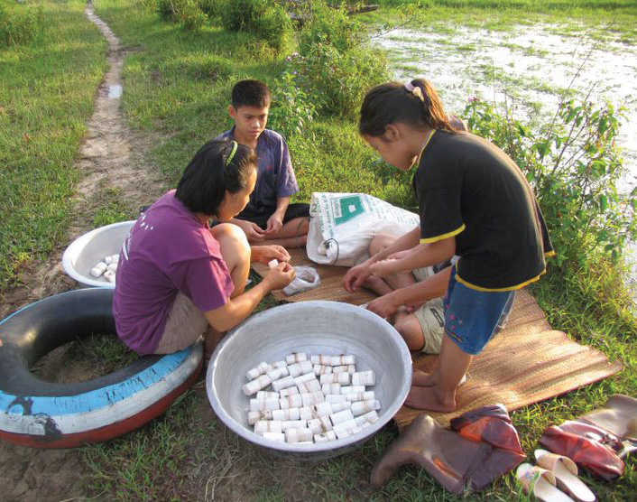 เด็กๆ ช่วยพ่อแม่เตรียมเบ็ดป่อมสำหรับตกปลาตอง (ปลาสลาด) ที่บึงโขงหลง จังหวัดบึงกาฬ