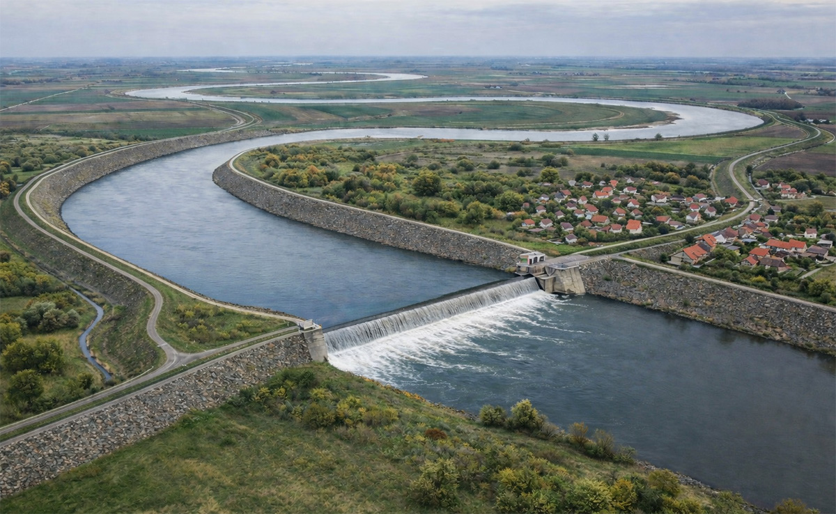 ภาพจำลองสิ่งก่อสร้างทางวิศวกรรมขนาดใหญ่ที่กีดขวางการไหลของน้ำและปิดกั้นไม่ให้น้ำไหลเข้าสู่ที่ราบน้ำท่วมถึง