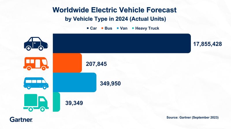 การ์ทเนอร์คาดการณ์ว่า ในปี 2567 ปริมาณการจัดส่งยานยนต์ไฟฟ้า (EV) ทั้งหมด ตั้งแต่ รถยนต์ (Cars) รถโดยสาร (Buses) รถตู้ (Vans) และรถบรรทุกขนาดใหญ่ (Heavy Trucks) จะมียอดรวมที่ 18.5 ล้านคัน  โดยในกลุ่มรถยนต์ไฟฟ้าจะคิดเป็น 97% ของยอดการจัดส่งยานยนต์ไฟฟ้าทั้งหมดในปีหน้า (ดูตารางที่ 1)