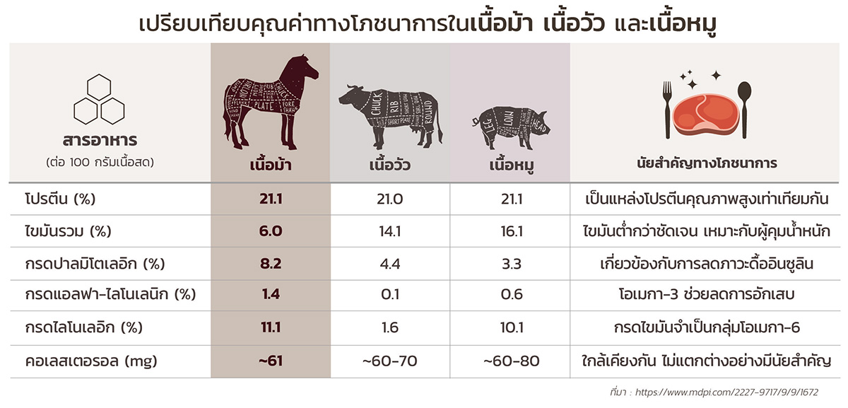 สิ่งที่ทำให้เนื้อม้าแตกต่างอย่างแท้จริงคือองค์ประกอบของไขมัน แม้จะมีปริมาณไขมันรวมต่ำ (ประมาณร้อยละ 6.0 เทียบกับในเนื้อวัว/หมูที่มีร้อยละ 14-16) แต่คุณภาพของไขมันนั้นมีความพิเศษ กล่าวคือ เนื้อม้าอุดมไปด้วยกรดไขมันไม่อิ่มตัว มีกรดปาล์มิโตเลอิก (palmitoleic acid) สูงถึงร้อยละ 8.2 (เทียบกับร้อยละ 4.4 ในวัว) และกรดอัลฟา-ไลโนเลนิก (alpha-linolenic acid: ALA) ซึ่งเป็นกรดไขมันโอเมกา-3 ที่ระดับร้อยละ 1.4 (เทียบกับร้อยละ 0.1 ในวัว) และมีอัตราส่วนระหว่างกรดไขมันไม่อิ่มตัวต่อกรดไขมันอิ่มตัว (PUFA:SFA ratio) อยู่ที่ 0.29 และอัตราส่วนโอเมกา-6 ต่อโอเมกา-3 (n-6:n-3 ratio) อยู่ที่ 10.2 ถือว่าเป็นสัดส่วนที่เอื้อต่อการลดความเสี่ยงของโรคหัวใจและหลอดเลือดได้ดีกว่าไขมันจากสัตว์เคี้ยวเอื้องทั่วไป นอกจากนี้ไขมันจากม้ามีจุดหลอมเหลวต่ำและย่อยง่ายกว่าไขมันวัวและแกะ ทำให้ร่างกายนำไปใช้ประโยชน์ได้ดี