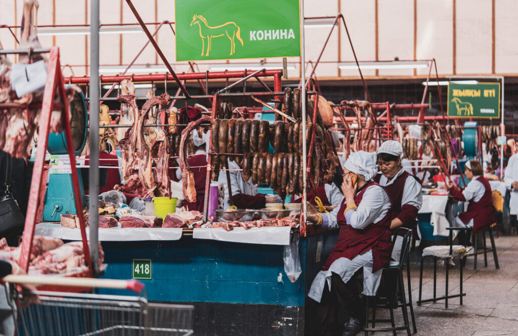 ร้านขายเนื้อม้าและไส้กรอกเนื้อม้าหมักในตลาดคาซัคสถาน