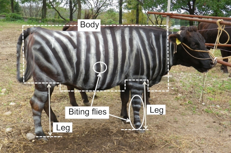 ผลการทดลองพบว่า วัวที่มีลายทางขาว-ดำสะบัดหางและเคลื่อนไหวเพื่อไล่แมลงวันน้อยกว่ากลุ่มอื่นๆ ถึง 20% ซึ่งแสดงให้เห็นว่าลายทางขาวสลับดำมีประสิทธิภาพในการไล่แมลงวันได้อย่างน่าทึ่ง นักวิทยาศาสตร์อธิบายปรากฏการณ์นี้ว่าเกี่ยวข้องกับระบบการมองเห็นของแมลงวัน ซึ่งมีลักษณะเฉพาะคือ