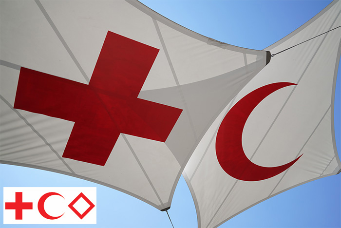 ตราสัญลักษณ์ กาชาดสีแดงบนพื้นขาว (red cross) เสี้ยววงเดือนแดง (red cresent) และคริสตัลแดง (red crystal)