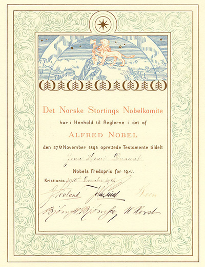 ประกาศนียบัตรรางวัลโนเบล สาขาสันติภาพ ที่มอบแก่อ็องรี ดูว์น็อง