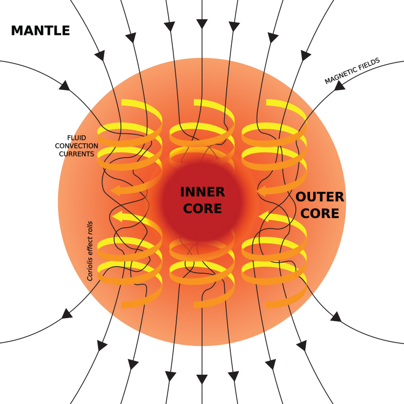 การเคลื่อนที่ของเหล็กร้อนใต้ผิวโลกทำให้เกิดสนามแม่เหล็ก