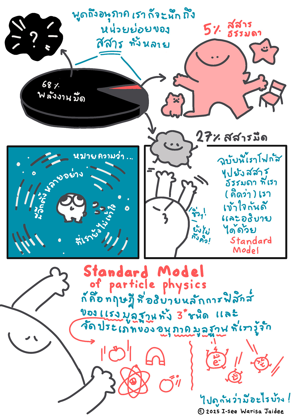 เอาละ ได้ทำความรู้จักกับอนุภาคต่าง ๆ กันไปพอประมาณแล้ว ต่อไปฉันจะขอลงลึกไปยังเจ้าอนุภาคตัวโปรดที่ฉันขลุกอยู่กับมันมาตลอดเวลาสี่ปีในการทำวิจัยระดับปริญญาตรี มันคือ… “นิวทริโน” นั่นเอง ! นักฟิสิกส์เองก็ยังไม่ค่อยรู้จักมันดี ทุกวันยังคงมีเรื่องราวค้นพบใหม่ ๆ มาอัปเดตกันตลอด นับเป็นเรื่องราวทางฟิสิกส์ที่รอให้เติมเต็มอยู่ ในฉบับหน้าฉันจะมาแนะนำ “เจ้านิวทริโน” ให้ทุกคนได้รู้จักกันอีกครั้ง