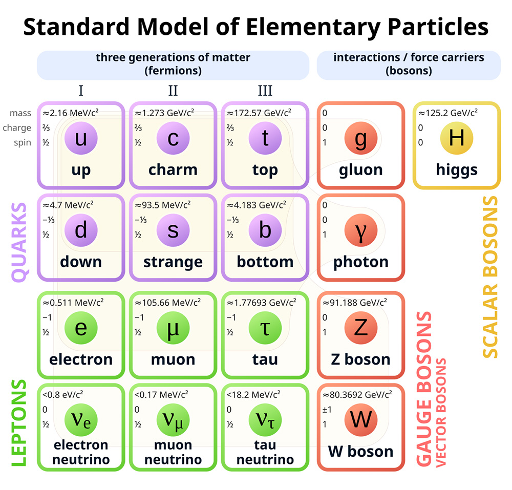 ภาพแบบจำลองมาตรฐาน (Standard Model) ทฤษฎีที่ใช้อธิบายอนุภาคมูลฐานทุกชนิดและแรงพื้นฐานสามอย่าง (แม่เหล็กไฟฟ้า แรงนิวเคลียร์เข้ม และแรงนิวเคลียร์อ่อน ยกเว้นแรงโน้มถ่วงยังไม่รวมเข้ามาในที่นี้) โดยมีโฟตอน, กลูออน, W โบซอน และ Z โบซอนเป็นพาหะแรง ส่วนฮิกส์โบซอนทำหน้าที่ให้มวลแก่อนุภาคอื่น ๆ ทั้งหมดนี้ใช้อธิบายหน่วยย่อยของสสารและปฏิสัมพันธ์ที่เรารู้จักในจักรวาล