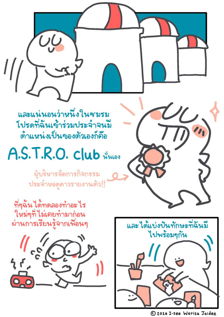 อีกผลงานที่ฉันภาคภูมิใจก็คือได้รับหน้าที่หลักวาดรูปโบรชัวร์และแผ่นระบายสีเอาไว้แจกผู้เข้าเยี่ยมชม รวมไปถึงการออกแบบสินค้าของชมรมเพื่อจำหน่ายและระดมทุนมาสนับสนุนชมรมอย่างสติกเกอร์และเสื้อประจำชมรม ฯลฯ ฉันไม่เคยคาดคิดมาก่อนว่าการได้ช่วยงานชมรมนี้ที่เริ่มจากการชอบมานอนดูดาวและนั่งวาดภาพเล่นจะนำไปสู่การได้ออกแบบและผลิตผลงานออกมาเป็นของที่ขายได้จริง ๆ ฉันรู้สึกขอบคุณเพื่อน ๆ ในชมรมที่ให้โอกาสได้แสดงออกผ่านงานศิลปะ และเชื่อมั่นในตัวฉันถึงขั้นนำเงินชมรมมาเป็นต้นทุนในการผลิตไปก่อน จนในที่สุดเราก็ขายได้กำไรเพียงพอที่จะนำทุนนั้นมาช่วยสนับสนุนกิจกรรมของชมรมในรุ่นต่อ ๆ ไปอีกนาน เย้ !