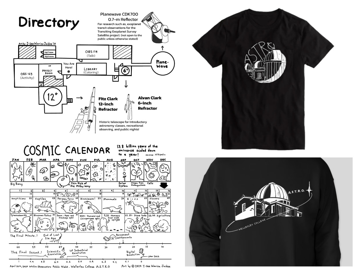 ชมรม A.S.T.R.O. ของเรายังมีกิจกรรม “Public Night” ซึ่งจัดขึ้นเป็นประจำทุกเดือนในคืนวันศุกร์ เปิดโอกาสให้ทั้งเด็กนักเรียน อาจารย์ รวมไปถึงบุคคลภายนอกได้เข้ามาเยี่ยมชมหอดูดาวและร่วมทำกิจกรรมทางดาราศาสตร์หลากหลายรูปแบบภายในมหาวิทยาลัย ฉันในฐานะสมาชิกชมรม ได้รับหน้าที่เป็นผู้จัดการกิจกรรมนี้โดยเฉพาะ หน้าที่รับผิดชอบคือ ต้องออกแบบกิจกรรมที่น่าสนใจ และสร้างความสนุกสนานให้กับผู้ชม ตามธีมของแต่ละเดือน ตัวอย่างกิจกรรมในช่วงที่ฉันรับหน้านี้ เช่น การจำลองหลักการของหลุมดำด้วยผ้ายางและลูกบอล กิจกรรมทำกำไลลูกปัดตามวงจรชีวิตของดาวฤกษ์ ฐานระบายสีเพื่อสร้างดาวเคราะห์นอกระบบตามจินตนาการ การนำหินอุกกาบาตออกมาโชว์ นอกเหนือจากการออกแบบกิจกรรมก็ต้องเตรียมกำลังพลตามที่วางแผนไว้ รวมไปถึงการจัดสรรหน้าที่ให้กับเพื่อน ๆ ที่ลงชื่อเข้ามาช่วยงานในแต่ละฐานกิจกรรม เนื่องด้วยผู้ดูงานมีความหลากหลายวัย ซึ่งส่วนใหญ่เป็นครอบครัวที่อยู่ในเมืองเวลส์ลีย์ ฉันได้ฝึกฝนการพูดบรรยาย นำทัวร์และสอนความรู้ด้านดาราศาสตร์สู่สาธารณชน ผ่านการคิดออกแบบกิจกรรมที่ช่วยให้ทุกคนได้เล่นและเรียนรู้ไปพร้อม ๆ กัน โดยเฉพาะในหัวข้อที่มีความเป็นนามธรรมสูง อย่างหลุมดำ หรือสสารมืด การใช้อุปกรณ์ ภาพวาด และแบบจำลอง จึงจำเป็นอย่างมากในการใช้เพื่อช่วยดึงดูดให้ฟิสิกส์ดาราศาสตร์น่าสนใจ อีกทั้งใช้ช่วยอธิบายให้เรื่องยาก ๆ เข้าใจได้โดยง่ายในเด็กระดับประถมศึกษาไปจนถึงคุณปู่คุณย่าคุณตาคุณยาย ให้ทั้งความสนุกและความรู้ไปในคราวเดียวกัน