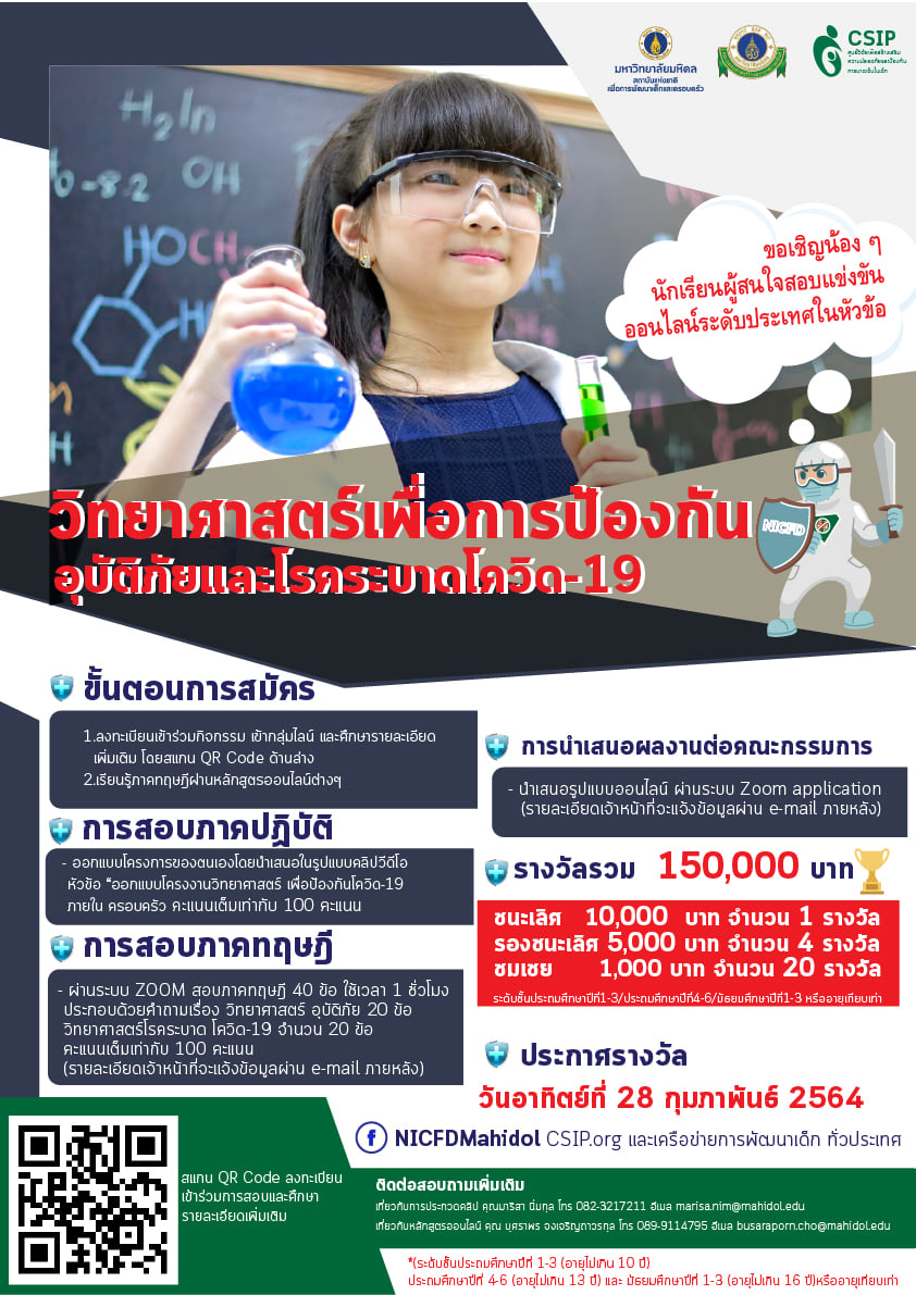 โดยกิจกรรมแบ่งออกเป็น 3 ระดับ คือ ป.1–3 ป.4-6 และ ม.1-3 ซึ่งปัจจุบันมีเด็กๆ สมัครเข้าร่วมกิจกรรมแล้วกว่า 300 ราย สำหรับผู้ปกครอง โรงเรียนที่สนใจ หรือหน่วยงานใดมีความประสงค์จะร่วมให้การสนับสนุนโครงการฯ สามารถติดต่อได้ทาง Facebook: NICFD หรือ CSIP www.cf.mahidol.ac.th ภายในวันที่ 15 กุมภาพันธ์ 2564 นี้